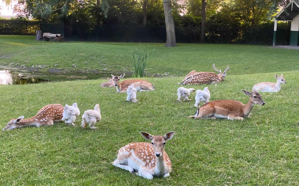 Het is een mooi glooiend terrein met een vijver in het midden en voldoende bomen voor schaduwwerking. Dit biedt voldoende ruimte voor de herten om hier prettig te verblijven. U kunt hiervan vanaf de wandelpaden met zitbank genieten.